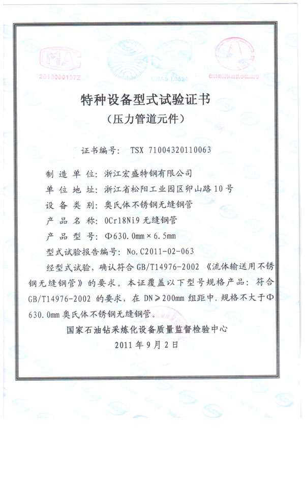 我們公司制造 牌號:0Cr18Ni9 規(guī)格:630mm×6.5mm 的大口徑薄壁不銹鋼管(無縫),通過國家石油鉆采煉化設(shè)備質(zhì)量監(jiān)督檢驗中心的特種設(shè)備形式試驗,證書編號:TSX 71004320110063 代表著我們在大口徑薄壁不銹鋼管(無縫)的制造技術(shù)在國內(nèi)處于領(lǐng)先的水準。目前也是浙江地區(qū)唯一可生產(chǎn)此類規(guī)格大口徑薄壁不銹鋼管(無縫)廠家。
