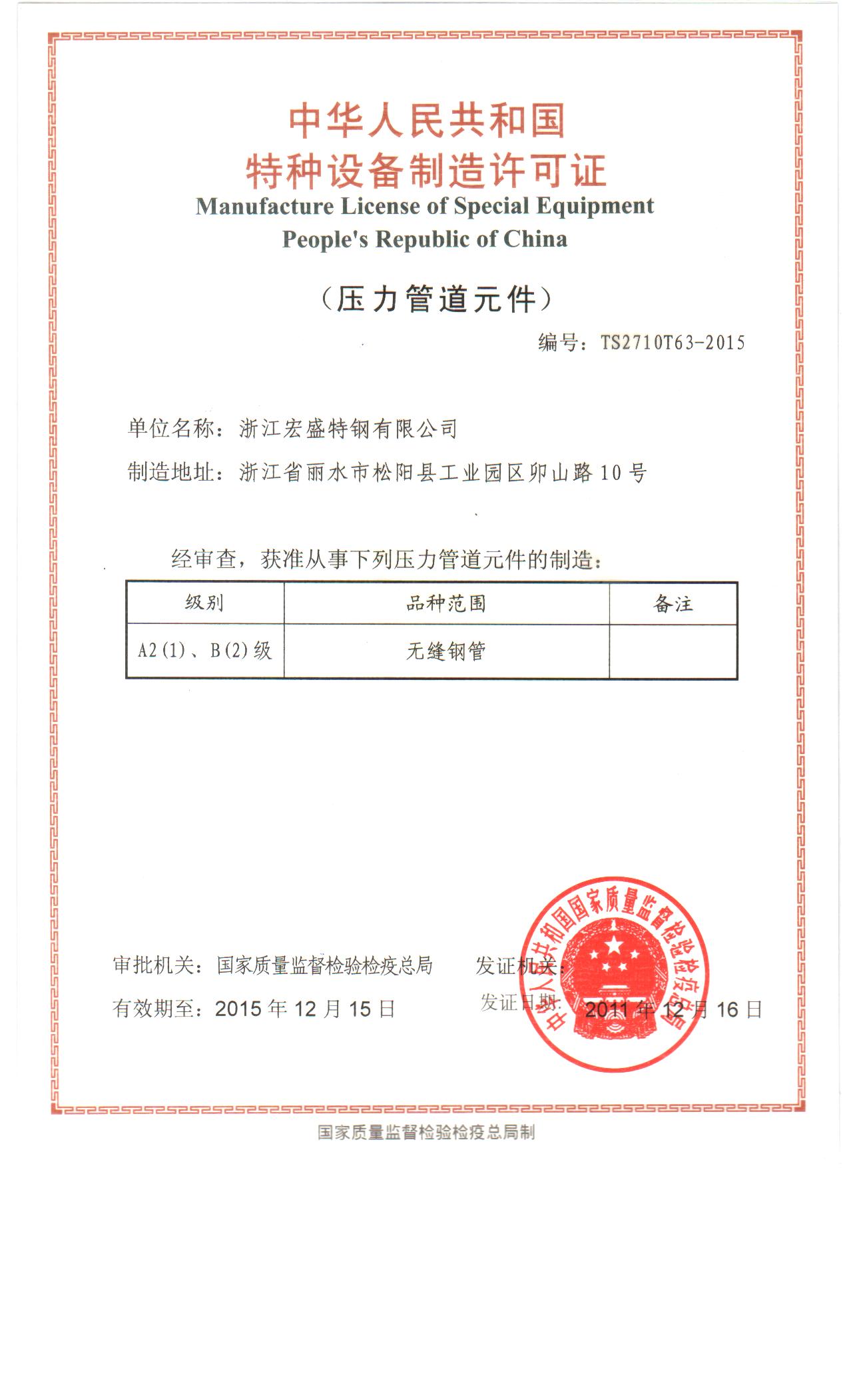 國家A2(1)、B(2)特種設備制造許可證(壓力管道元件),證書編號:TS2710T63-2015